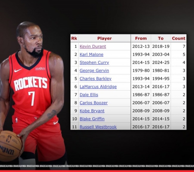 杜兰特在休斯敦对阵火箭季后赛共砍下7次30+,为历史最多(共7场)。