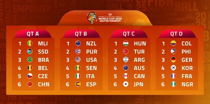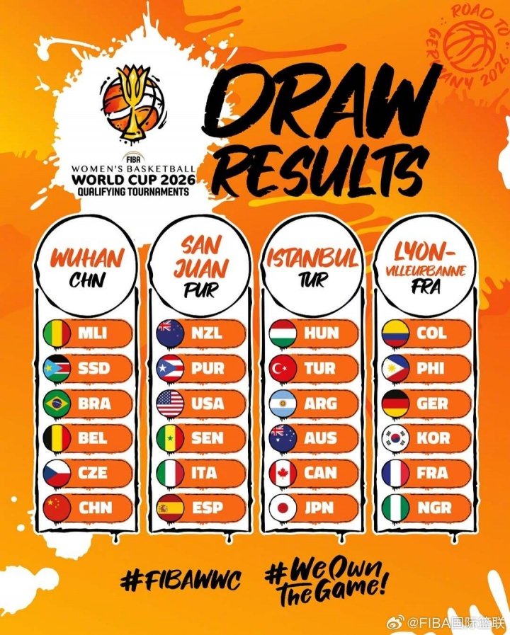 10月08日讯 2026年女篮世界杯预选赛抽签结果出炉,24支球队被分为4组进行比赛。