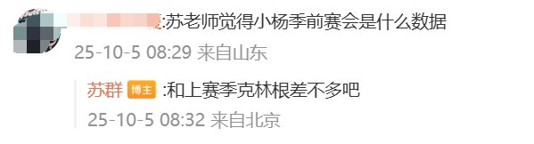 随后,苏群在评论区与网友互动时表示:“杨瀚森的季前赛数据会和上赛季克林根的差不多。”