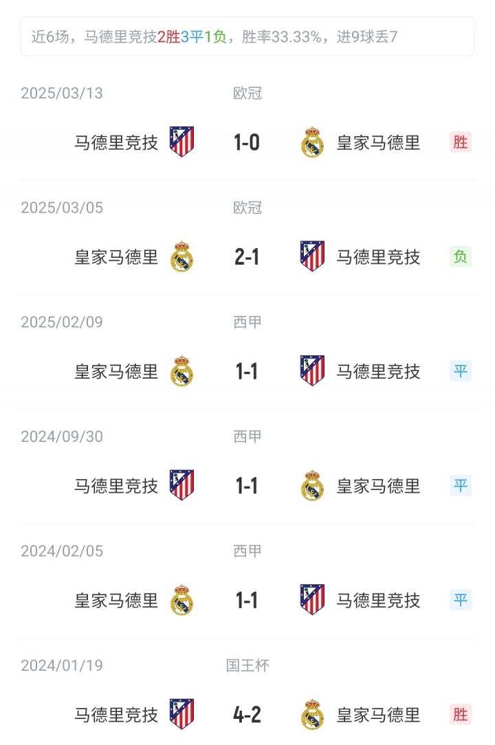 目前西甲积分榜上,马竞2胜3平1负积9分,位列第8;皇马6战全胜积18分,位列榜首。