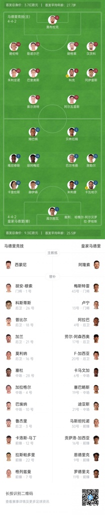 皇马首发:1-库尔图瓦、18-卡雷拉斯、24-赫伊森、3-米利唐、2-卡瓦哈尔、5-贝林厄姆、14-琼阿梅尼、8-巴尔韦德、7-维尼修斯、10-姆巴佩、15-居勒尔